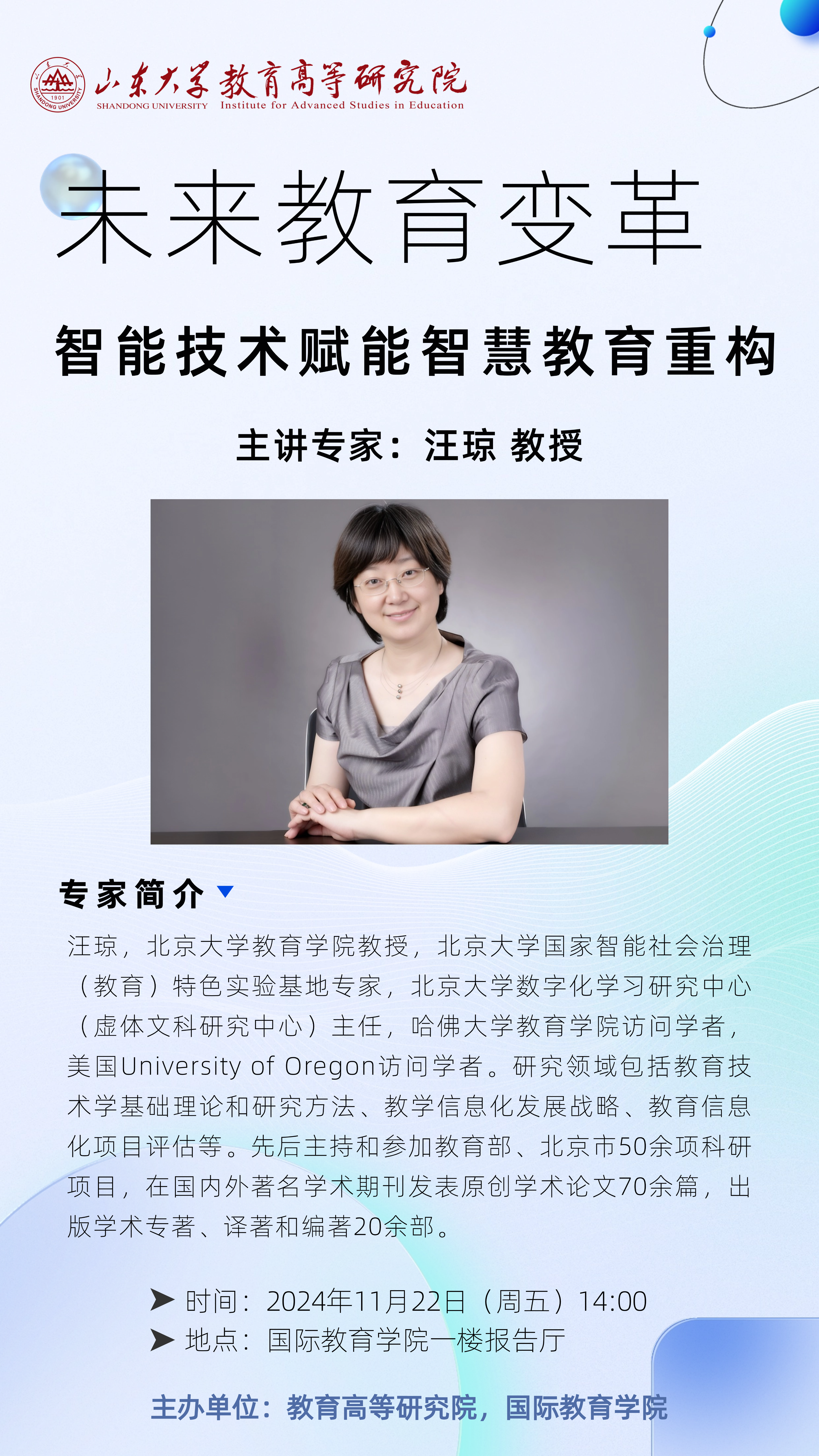 汪琼,北京大学教育学院教授,北京大学国家智能社会治理(教育)特色实验基地专家,北京大学数字化学习研究中心(虚体文科研究中心)主任,哈佛大学教育学院访问学者,美国俄勒冈大学访问学者,英国爱丁堡大学访问学者。研究领域包括教育技术学基础理论和研究方法、教学信息化发展战略、教育信息化项目评估等。先后主持和参加教育部、北京市50余项科研项目,在国内外著名学术期刊发表原创学术论文70余篇,出版学术专著、译著和编著20余部。