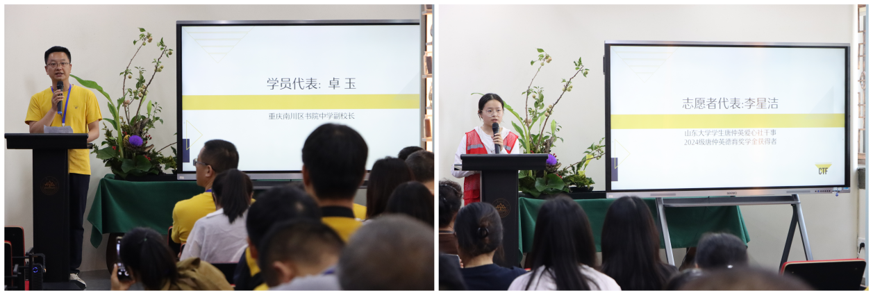 随后,学员代表重庆南川区书院中学副校长卓玉分享了自己深耕教育一线十八载的感悟,他深情追忆唐仲英先生,认为公益爱心与教育事业相辅相成,正如唐先生用行动诠释的那样,爱心是点亮成长之路的光,他也呼吁更多人加入这份温暖的事业,让善意滋养更多心灵。