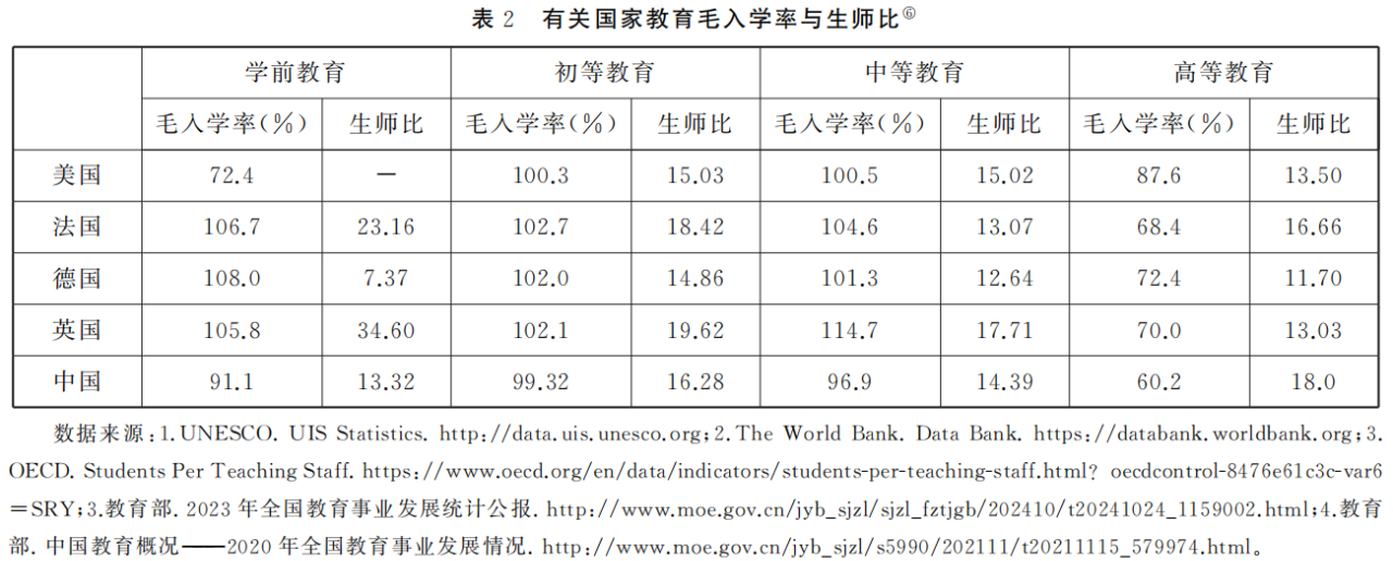 ⑥在“毛入学率”指标中,我国学前教育、初等教育和高等教育统计数据的年份为2023年,中等教育统计数据的年份为2020年;其他国家统计数据的年份为2020年。在“生师比”指标中,我国统计数据的年份为2023年,其他国家统计数据的年份为2020年。
