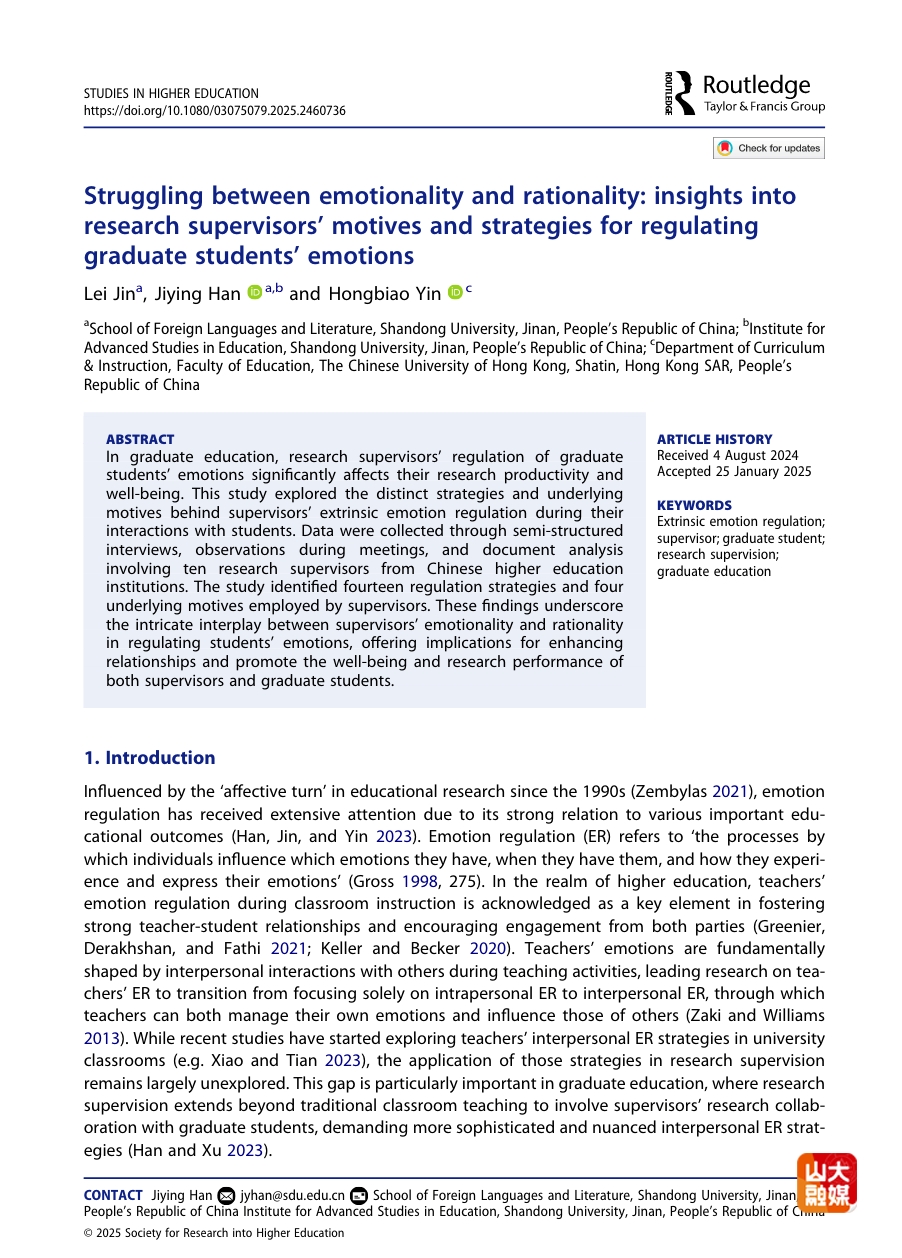 论文“Struggling between emotionality and rationality: insights into research supervisors’ motives and strategies for regulating graduate students’ emotions”发表于Studies in Higher Education(影响因子:3.7)。金蕾为第一作者,韩佶颖教授为通讯作者,奈飞影视