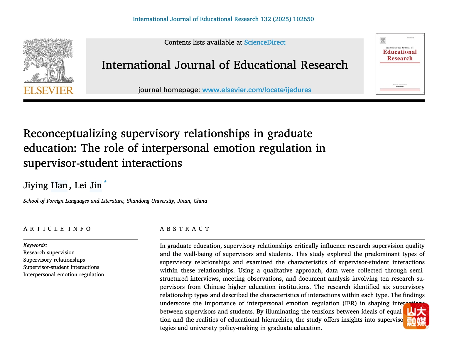 [本站讯]近日,外国语学院教授韩佶颖、2022级博士研究生金蕾在教育学与教育研究领域SSCI一区顶级期刊发表系列研究成果,深度聚焦研究生导师情绪调节与导学关系优化。该系列论文作为2024年教育部人文社会科学研究规划基金项目“人际情绪调节视角下研究生教育导学关系重构与优化”的阶段性研究成果。项目团队基于人际情绪调节的理论框架,综合运用半结构化访谈、研究生组会观察与文本分析等质性研究方法,对十位导师的师生互动过程展开实证研究,揭示其通过调节自我以及学生情绪构建和谐导学关系的实践路径。