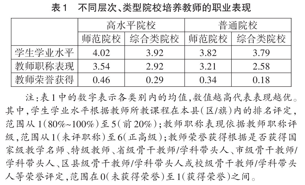 对本次调研采集的数据进行分析发现,培养院校的层次对教师职业表现(学生学业成绩、教师职称表现、教师荣誉获得)有非常显著的影响,而且这种影响比院校类型(师范院校或非师范院校)更为重要。具体来看,在学生学业成绩方面,高水平院校(省属重点及以上院校)毕业教师指导学生的学业水平明显高于普通院校,这表明院校层次对学生成绩有显著影响。在体现教师专业发展的指标上,如职称表现和荣誉称号获得,高水平院校毕业教师的表现同样明显高于普通院校,这进一步印证了院校层次的重要性。同时,同层次院校当中,师范院校毕业教师的表现高于综合类院校。(见表1)