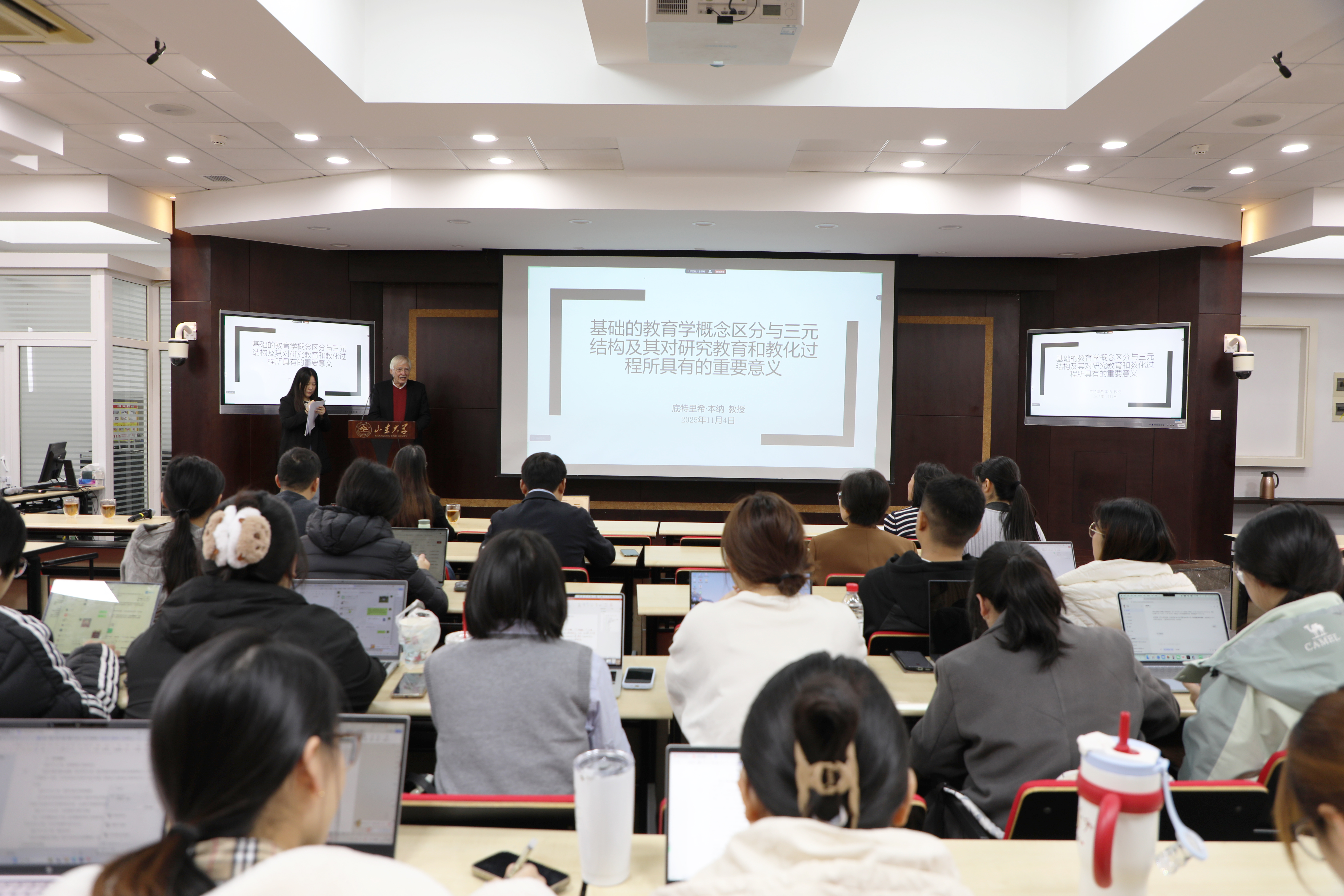 本纳教授通过对“基础的教育学概念区分与三元结构”的分析,揭示了现代教育的自身逻辑(Eigenlogik)与其有效性基础。讲座首先区分了前现代与现代教育的根本差异。教育在前现代社会中服务于既定的社会秩序,而在现代社会中则面对开放与不确定的未来,因此必须重新建构自身的理论逻辑。现代教育实践的意义不在于知识的灌输,而在于通过教育性中断激活学习者的反思与生成能力,从而在多元知识体系与公共生活中形成可持续的理解与沟通。这一理论为现代教育研究提供了方法论与价值论的双重基础。在互动环节,本纳教授与现场老师们展开了充分的讨论。